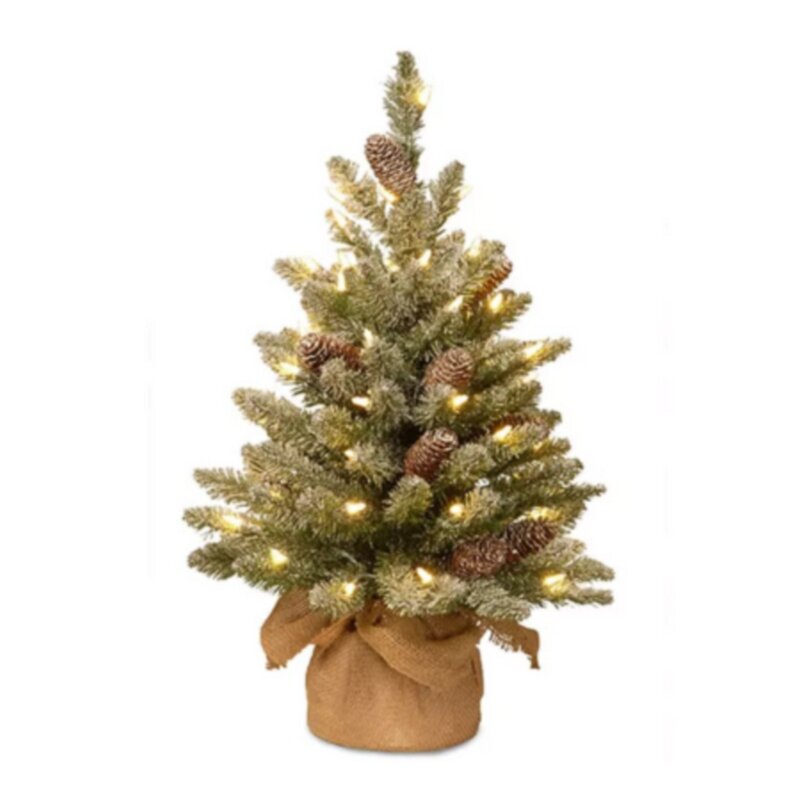 Kunstkerstboom met burlap-voet en 50 LED-lampjes op batterij. Compact en sfeervol.